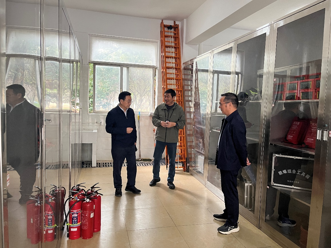 在应急救援站,程裕秋副厅长仔细检查了应急救援装备的配备与维护情况,询问了应急演练开展和队员培训机制。他要求学校进一步强化应急处置能力建设,确保在突发情况下能够快速、科学、有效开展救援工作。