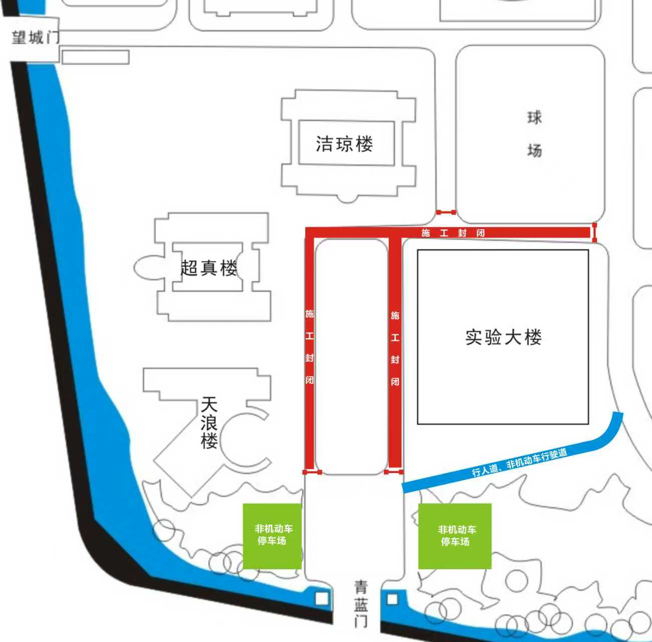 目前,青蓝门的青蓝广场区域仍在施工。广场环形道路及新实验大楼北侧道路已全部封闭,禁止一切机动车、非机动车和行人通行。需前往青蓝门、国际教育学院、美术学院、音乐学院的师生,请绕行新实验大楼南侧小道(仅限步行或骑行非机动车)。共享电单车请停放在青蓝广场西侧非机动车停车场。